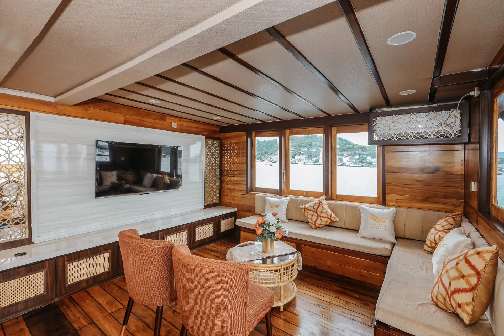 This space is the heart of Elrora Liveaboard, where comfort and warmth come together. With soft seating, cool air, and large windows framing the islands, the living room is the perfect place to relax, enjoy conversations, or sip a morning coffee while sailing across beautiful waters.